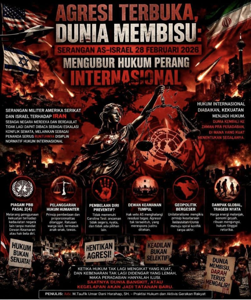 Serangan militer Amerika Serikat dan Israel terhadap Iran sebagai negara yang merdeka dan berdaulat pada 28 Februari 2026 tidak lagi dapat dibaca sebagai eskalasi konflik semata, melainkan sebagai penanda serius runtuhnya disiplin normatif hukum internasional yang sejak Perang Dunia II dijaga melalui Piagam Perserikatan Bangsa-Bangsa, khususnya prinsip larangan penggunaan kekuatan tanpa legitimasi kolektif; ketika norma tersebut dilanggar secara terbuka tanpa konsekuensi hukum yang tegas, dunia seakan diseret mundur ke fase praperadaban, dimana relasi antar negara ditentukan oleh superioritas militer, bukan supremasi hukum, sementara mekanisme global kehilangan daya paksa akibat dominasi kepentingan politik negara kuat; dalam konteks ini, hukum internasional tidak sekadar melemah, tetapi mengalami delegitimasi struktural—berubah dari sistem yang mengikat menjadi sekadar simbol moral yang mudah diabaikan—sehingga praktik kekuasaan yang brutal, arogan, ugal-ugalan dan nir-akuntabilitas menemukan ruang legitimasi baru, memperlihatkan bahwa tanpa pembaruan yang serius dan keberanian kolektif untuk menegakkan keadilan, tatanan hukum global hanya akan menjadi retorika kosong di hadapan ambisi dan syahwat dari hegemonik negara adidaya.