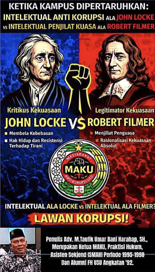Pada titik inilah, pilihan menjadi terang: kampus harus kembali pada tradisi kritis John Locke sebagaimana diteladani oleh intelektual yang tergabung dalam Masyarakat Anti Korupsi USU—menjadi ruang nalar yang merdeka, penjaga akal sehat publik, dan benteng etika yang tegas melawan korupsi; sebab ketika kampus tergelincir mengikuti logika Robert Filmer yang menormalisasi kepatuhan tanpa kritik, ia tak lagi menjadi pusat pencerahan, melainkan berubah menjadi instrumen legitimasi kekuasaan dan pembenar penyimpangan. Dalam lanskap demikian, yang dipertaruhkan bukan sekadar integritas akademik, melainkan fondasi demokrasi itu sendiri, karena sejarah telah berulang kali menunjukkan—sebagaimana diingatkan Lord Acton—bahwa kekuasaan yang tak diawasi akan cenderung korup; maka garis batas antara yang benar dan yang salah, antara yang baik dan yang buruk, harus dijaga secara tegas oleh kampus sebagai otoritas moral terakhir dalam kehidupan publik.
