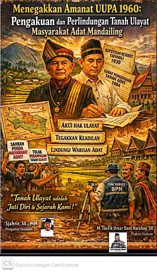 Dalam konteks Mandailing Natal, keberadaan masyarakat adat dan wilayah ulayat bukan sekadar narasi budaya, melainkan fakta historis yang terdokumentasi secara administratif maupun kolonial. Arsip lokal menunjukkan adanya pengakuan resmi terhadap tanah ulayat Raja Panusunan Bagas Panyabungan Tonga-Tonga yang luasnya diperkirakan mencapai sekitar 60.000 hektare. Dokumen ini bahkan dilengkapi dengan peta wilayah serta batas-batas administratif yang diakui pada masanya.