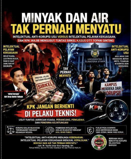 Pada akhirnya, garis pemisah itu kembali menjadi jelas: antara yang menjaga kebenaran dan yang membungkus kepalsuan dalam pembiaran dan penikmat korupsi uang rakyat. Kasus Topan Obaja Putra Ginting bukan hanya ujian bagi aparat penegak hukum, tetapi juga bagi komunitas intelektual yang tergabung dalam masyarakat Anti Korupsi USU (MAKU) dan Indonesia secara luas. Jika korupsi adalah kejahatan kera putih yang terorganisir dan sistemik terhadap keuangan negara, maka pembiaran dan pembenaran oleh intelektual adalah kejahatan terhadap akal sehat publik. Dan seperti minyak dan air, keduanya tidak akan pernah menyatu—publik pada akhirnya akan mampu membedakan mana yang jernih, dan mana yang keruh.