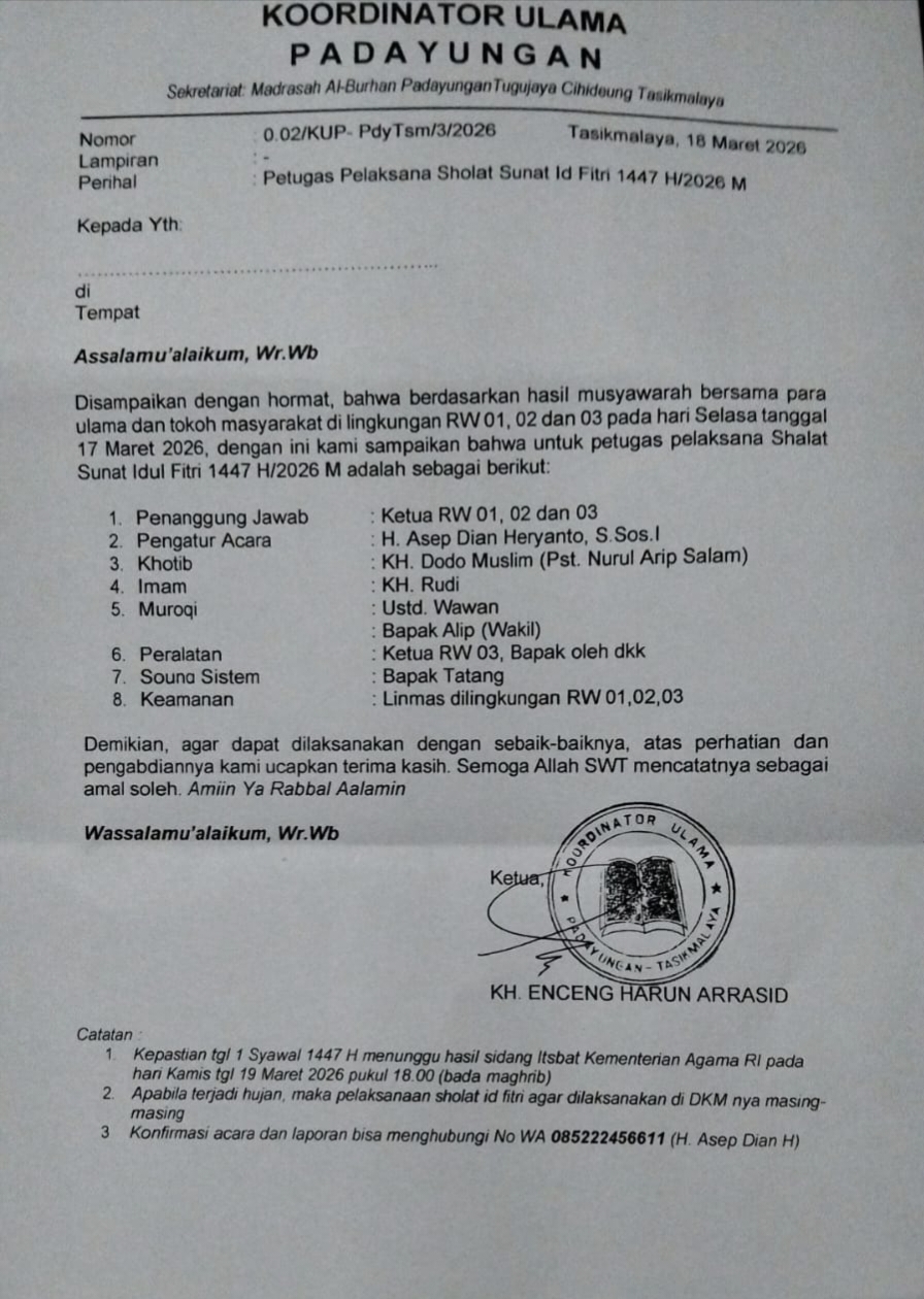 Suasana penuh haru dan kekhusyukan menyelimuti pelaksanaan Sholat Idul Fitri 1447 Hijriah di kawasan Bundaran Padayungan, Desa Tugu Jaya, Kecamatan Cihideung, Kota Tasikmalaya, Sabtu (21/03/2026).